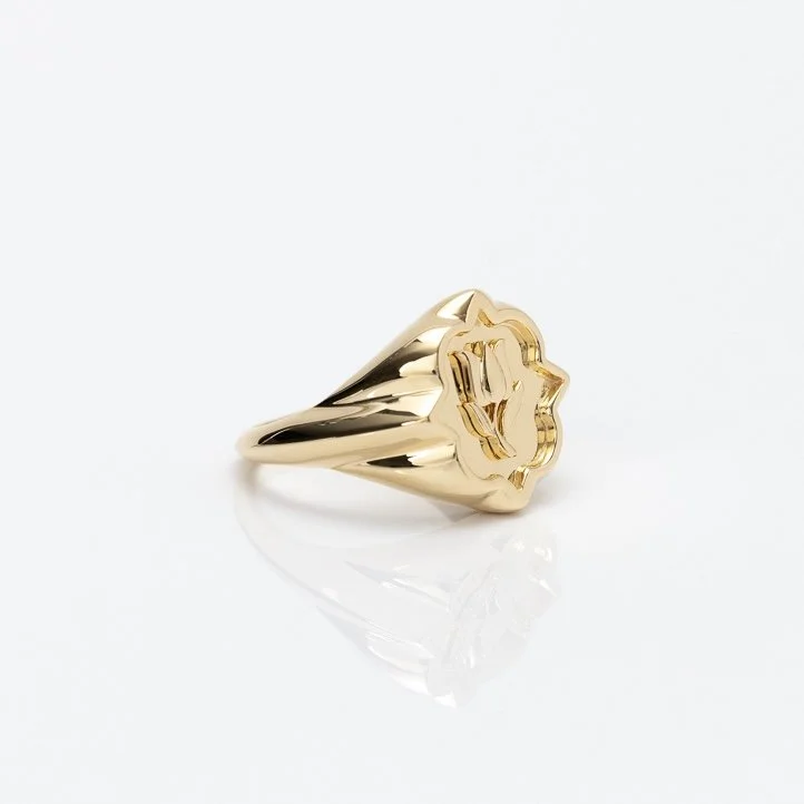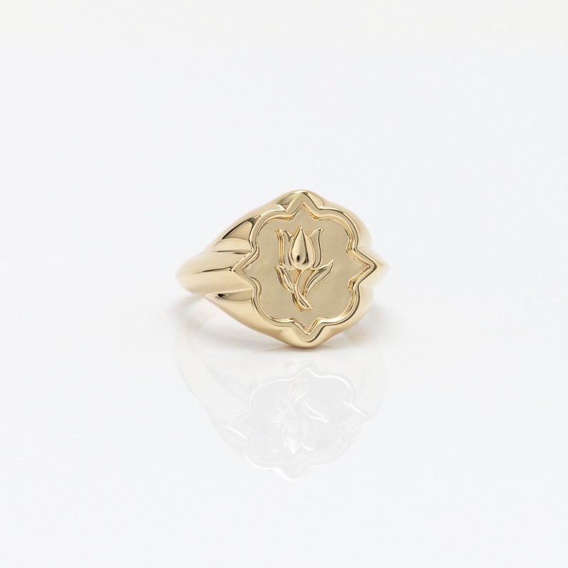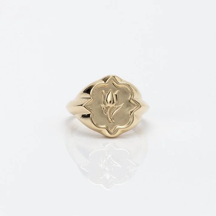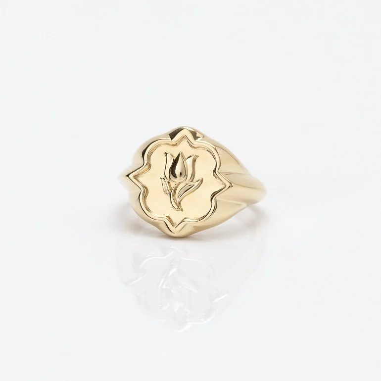 A folk inspired tulip sits at the center of a curvy signet with fluted shoulders. Crafted in 14k yellow gold. Measures 15mm tall. Solid and weighty.
