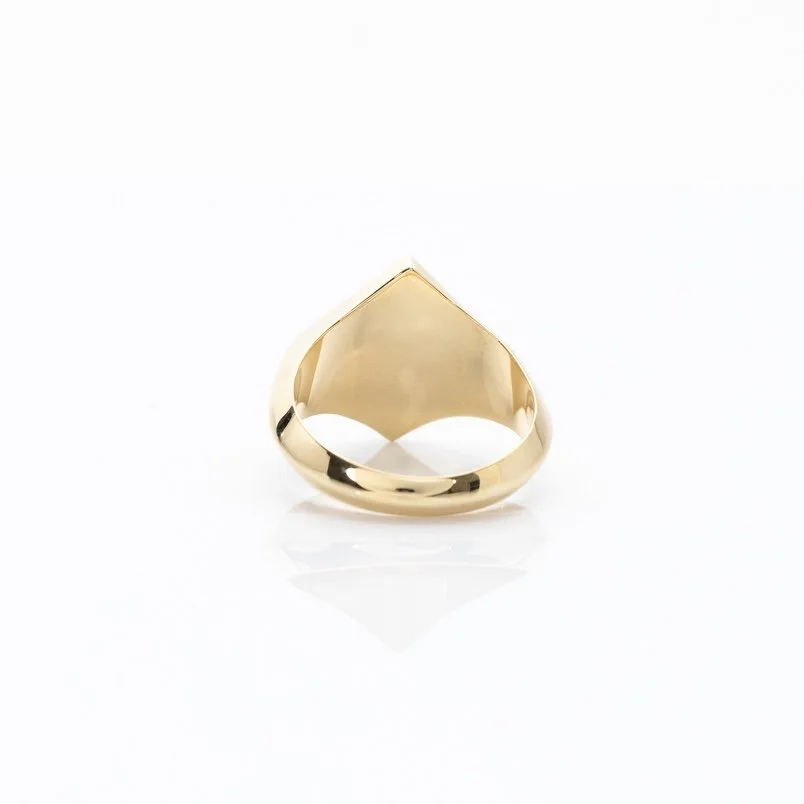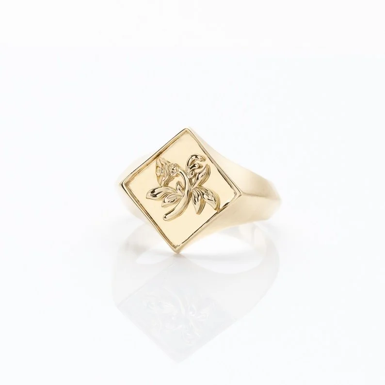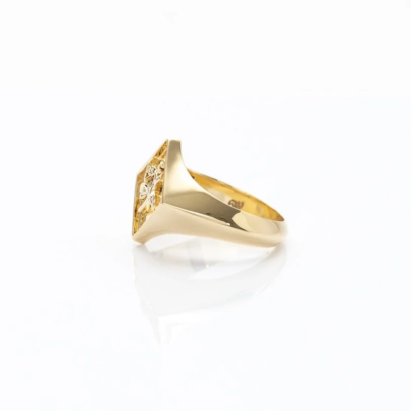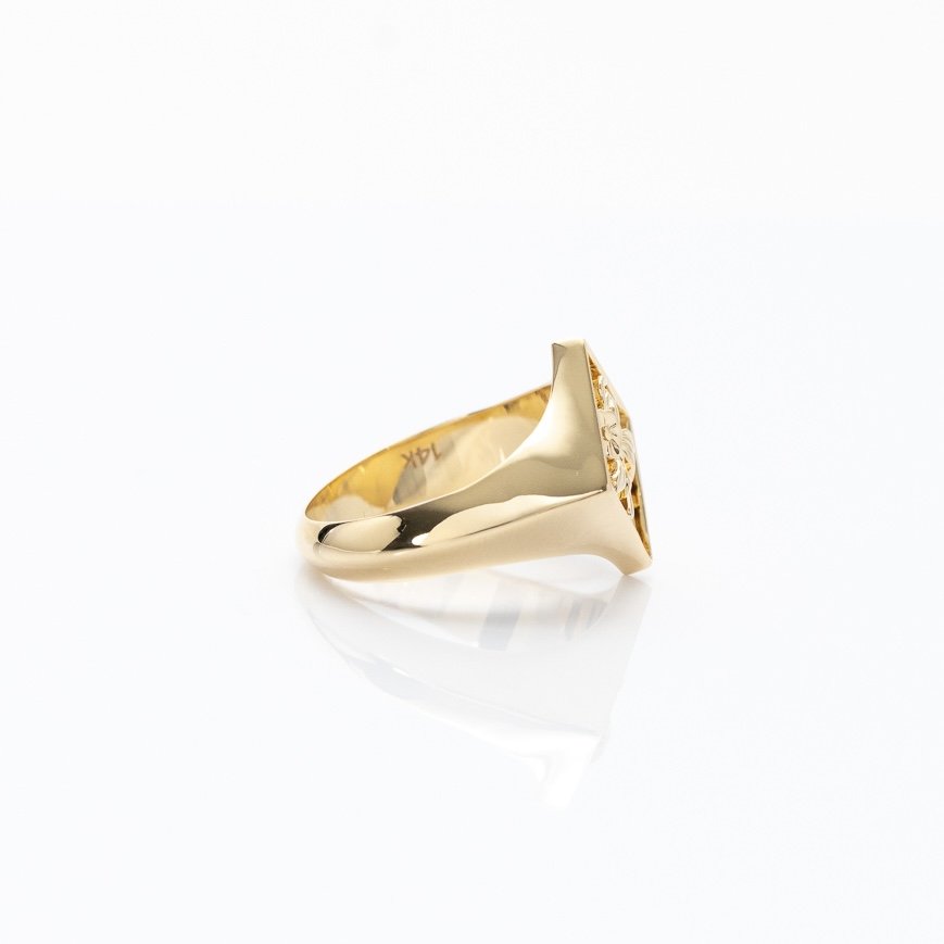 Crafted in 14k yellow gold, this signet has a diamond shaped face with a folk inspired morning glory flower at its center. Measures approx 15mm tall. Solid and weighty.