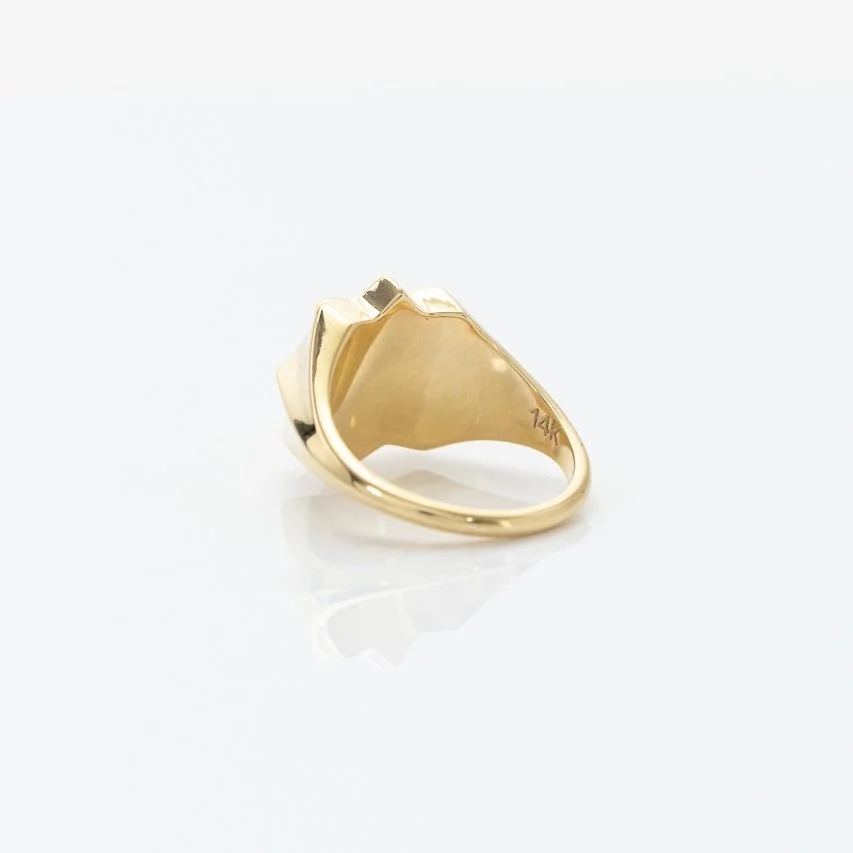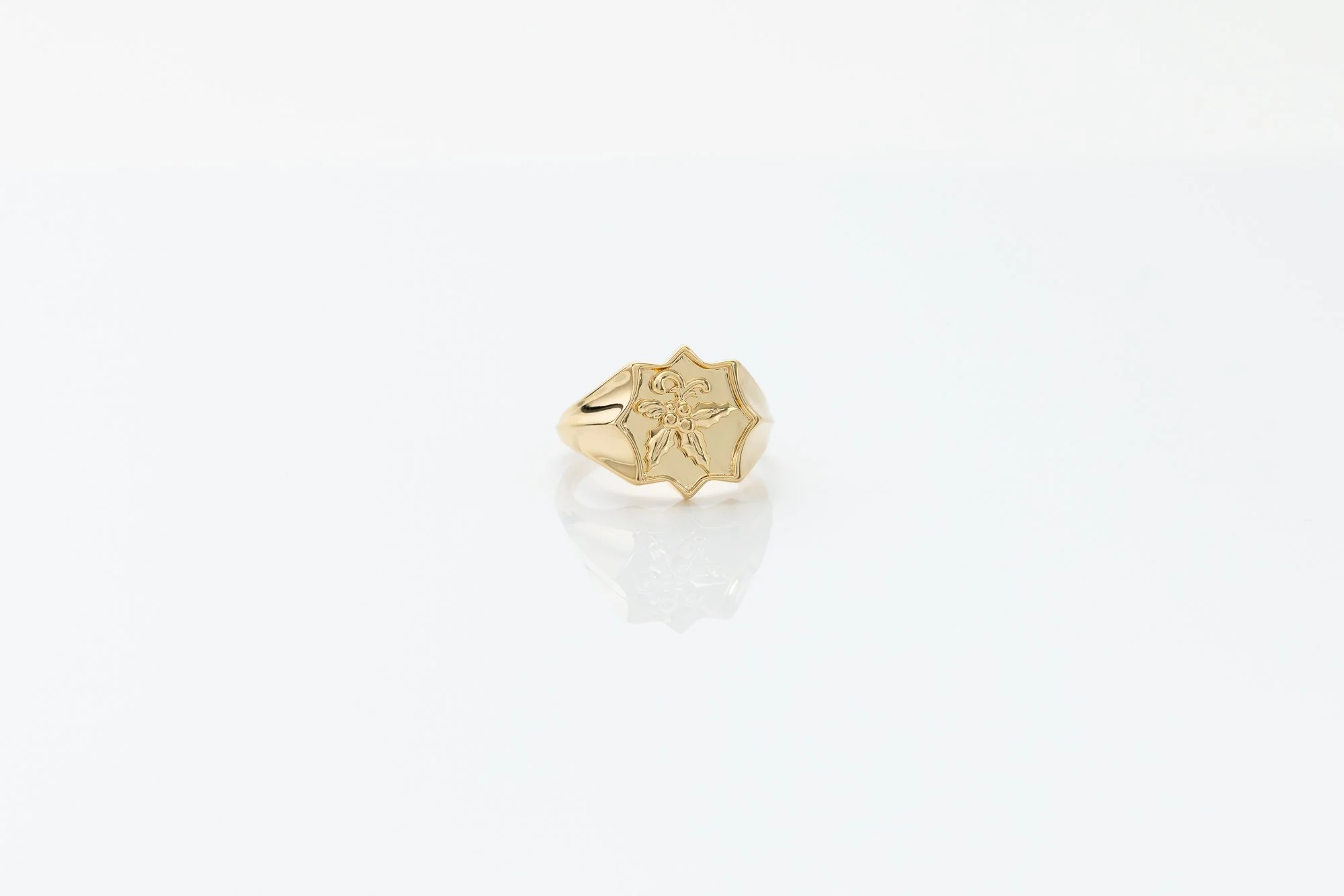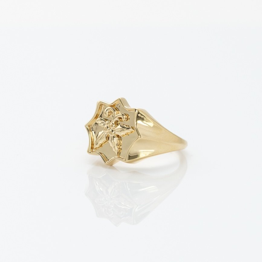 14k yellow gold signet with a starburst shape and a sprig of Holly at the center. Inspired by folky European florals. Measures approx 14mm tall on the face. Solid and weighty.