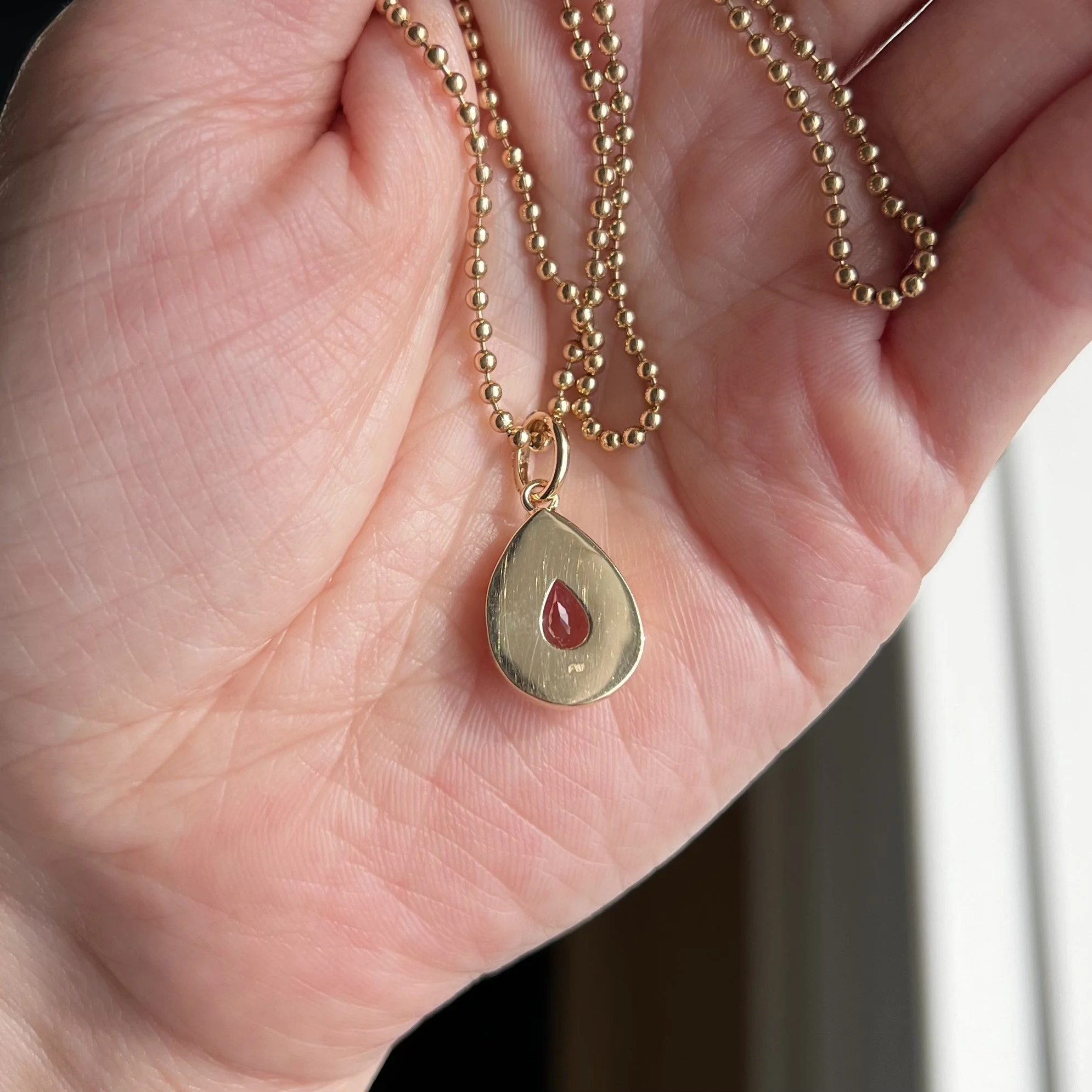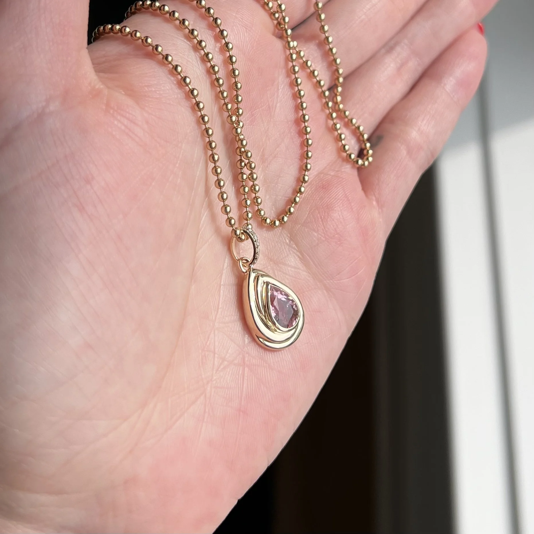 The Infinity Charm: a Fare Well Fine Original. A 14k yellow gold bezel set 1.89ct pear shaped light pink tourmaline, with a spiraling infinity knot surrounding it. Natural diamond bail. Measures approx 19mm tall, weighs 3.40grams.