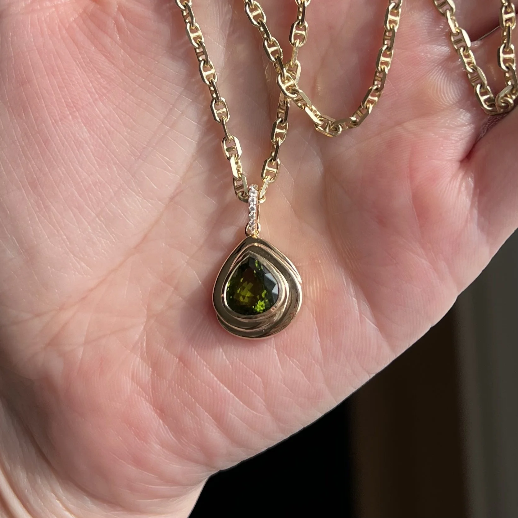 The Infinity Charm: a Fare Well Fine Original. A 14k yellow gold bezel set 3.07ct pear shaped warm green tourmaline, with a spiraling infinity knot surrounding it. Natural diamond bail. Measures approx 17mm tall, weighs 4.53 grams.