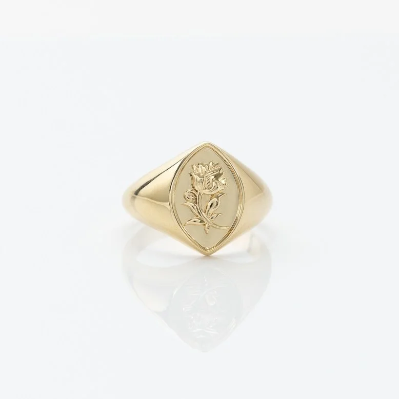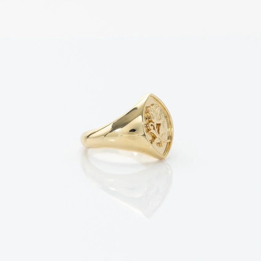 Crafted in 14k yellow gold, the poppy flower is a folk inspired image at the center of the marquis shaped signet ring. Measures approx 15mm tall, solid and weighty.