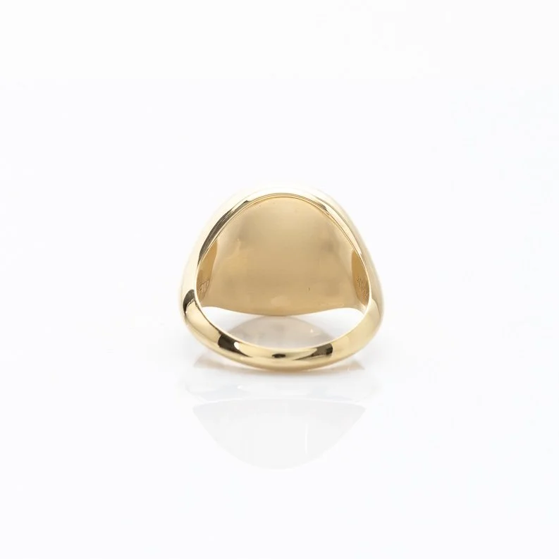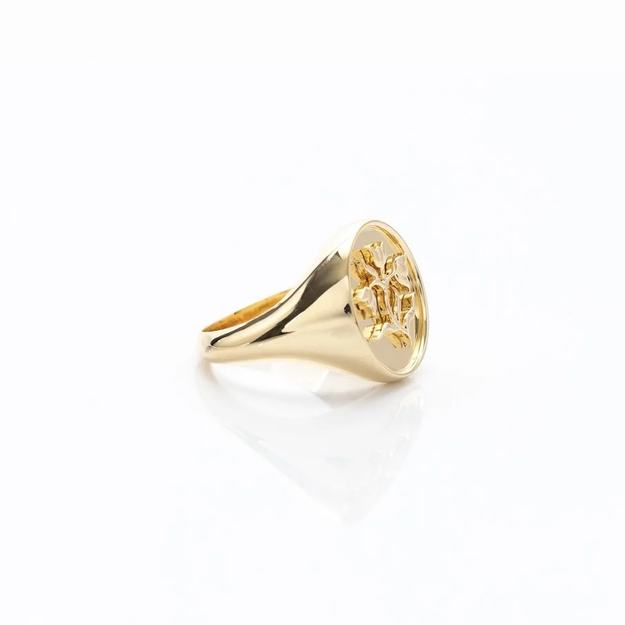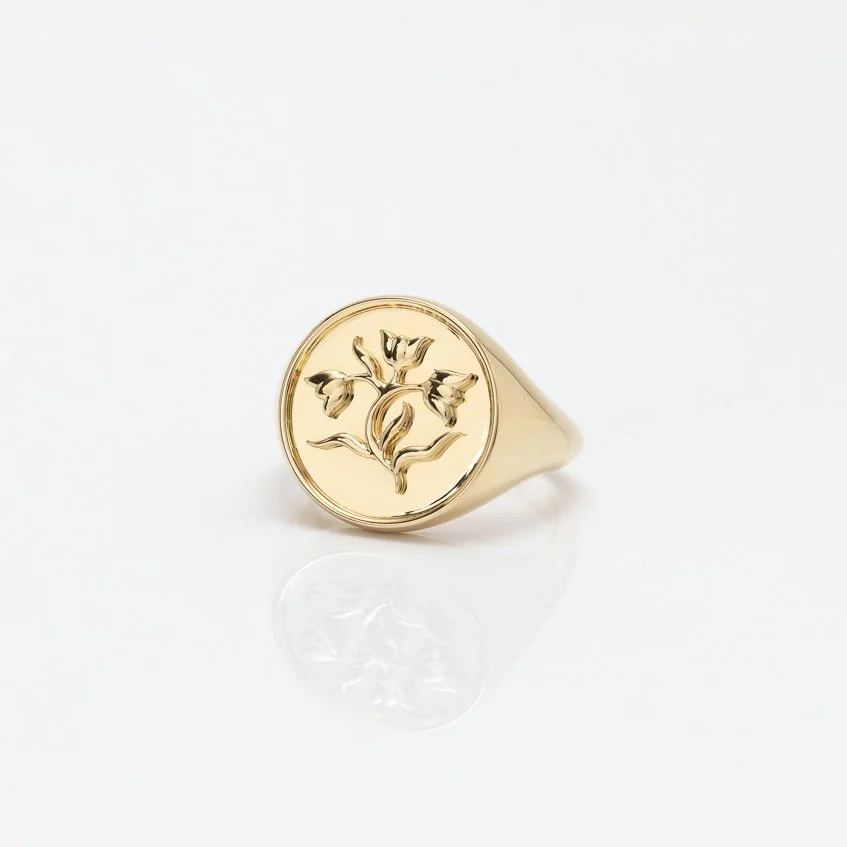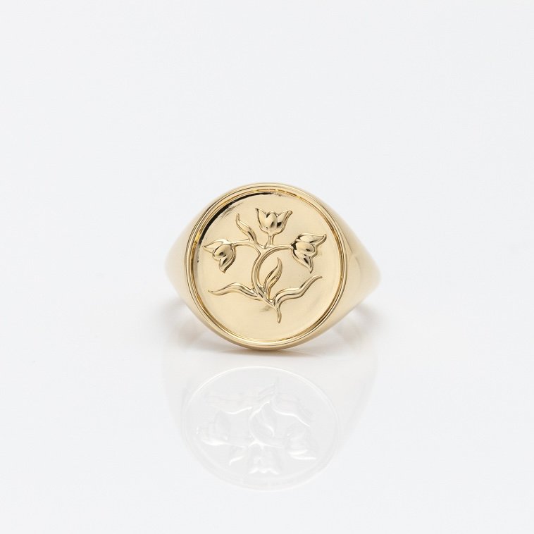 This classic round signet is crafted in 14k yellow gold, with a folk inspired interpretation of the Lily of the Valley at its center. Measures approx 16mm tall. Solid and weighty.