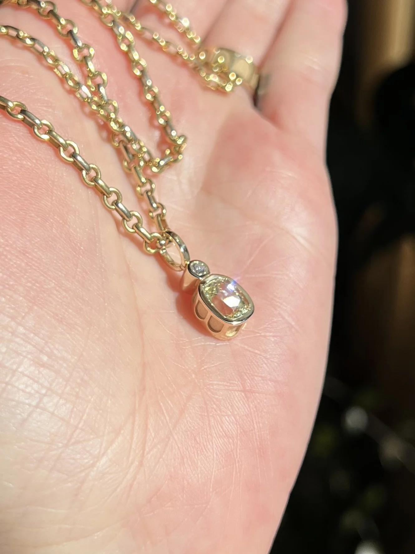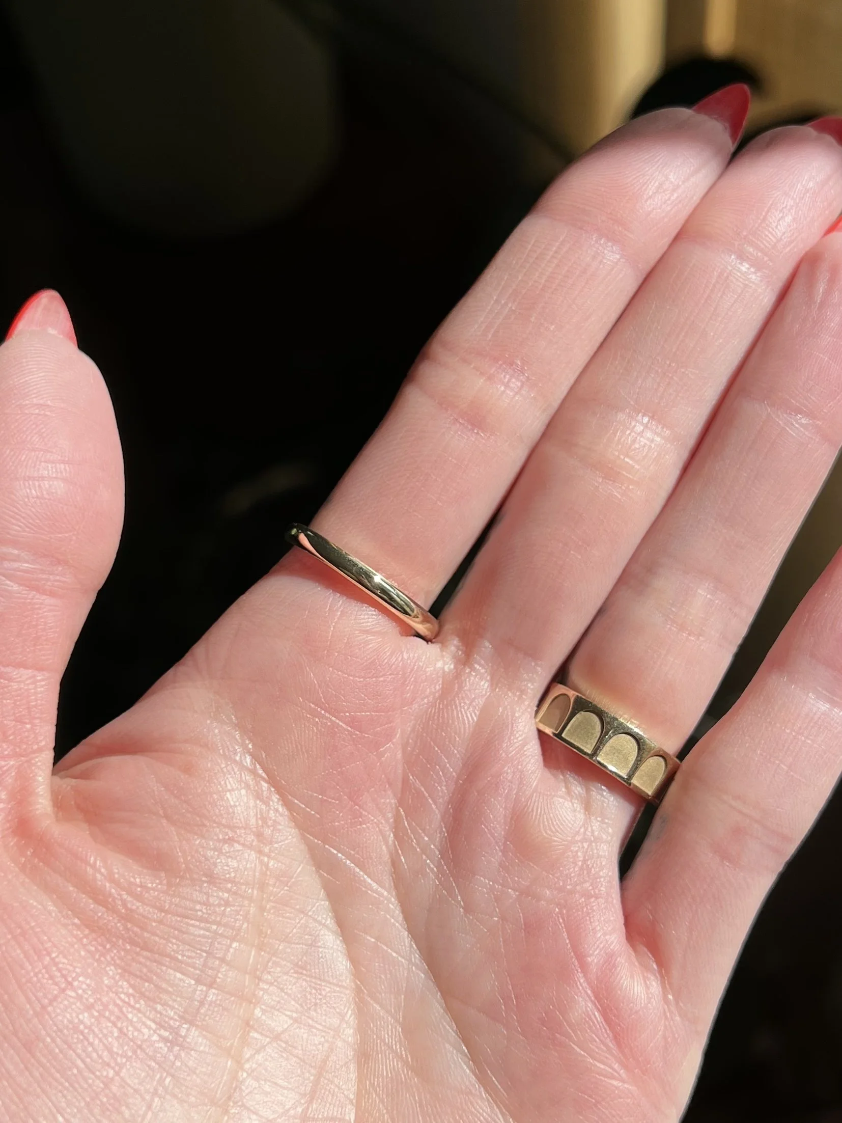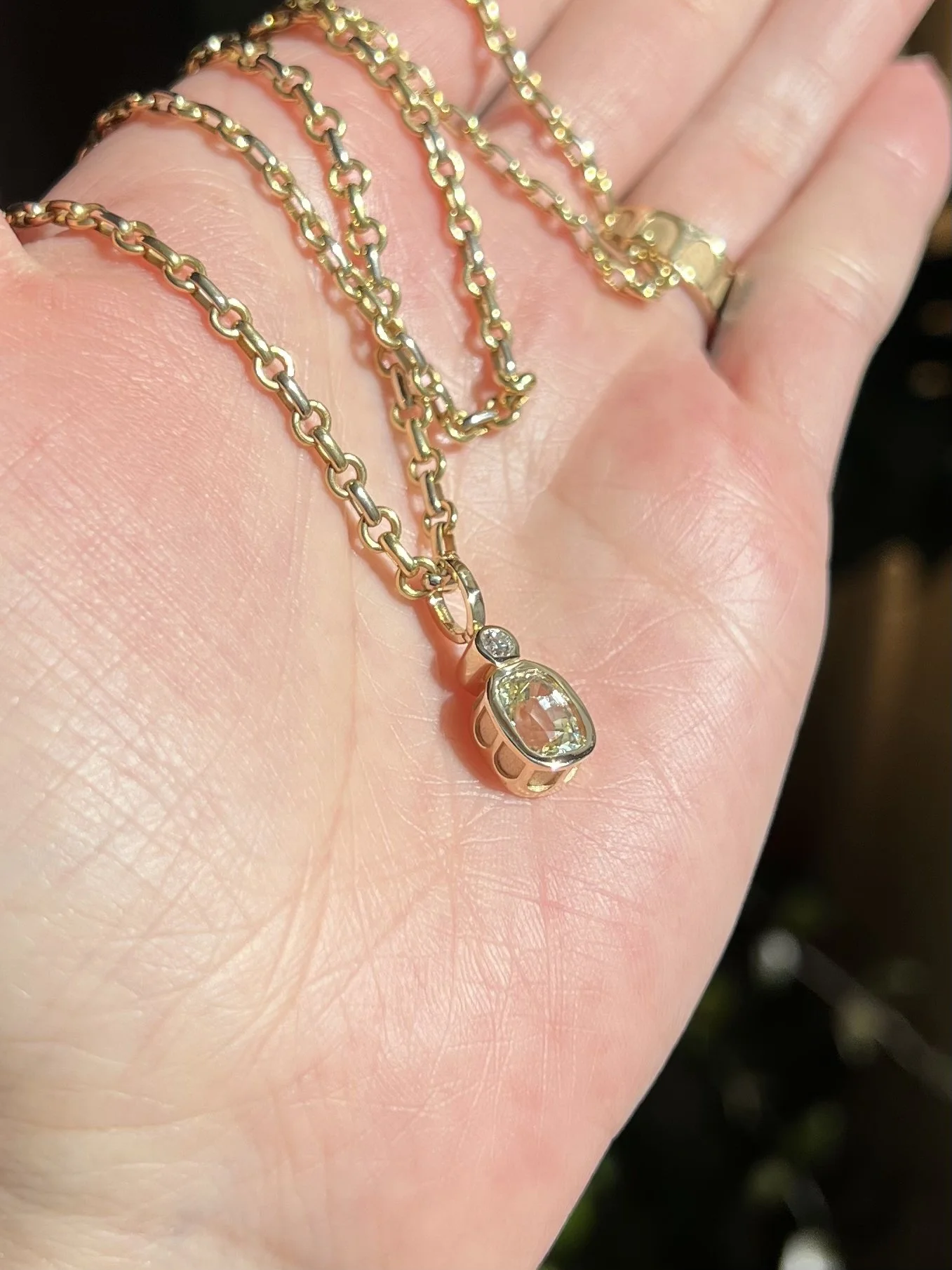 The Petal Ring: a Fare Well Fine Original made in 14k yellow gold. This ring has a 2.41 carat trillion Peridot, set in the signature petal setting with a chunky band. Size 6.75 and sizable. Weighs approx 4.84 grams.