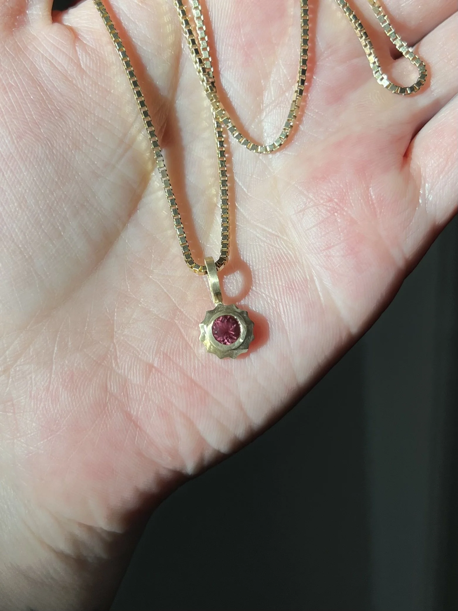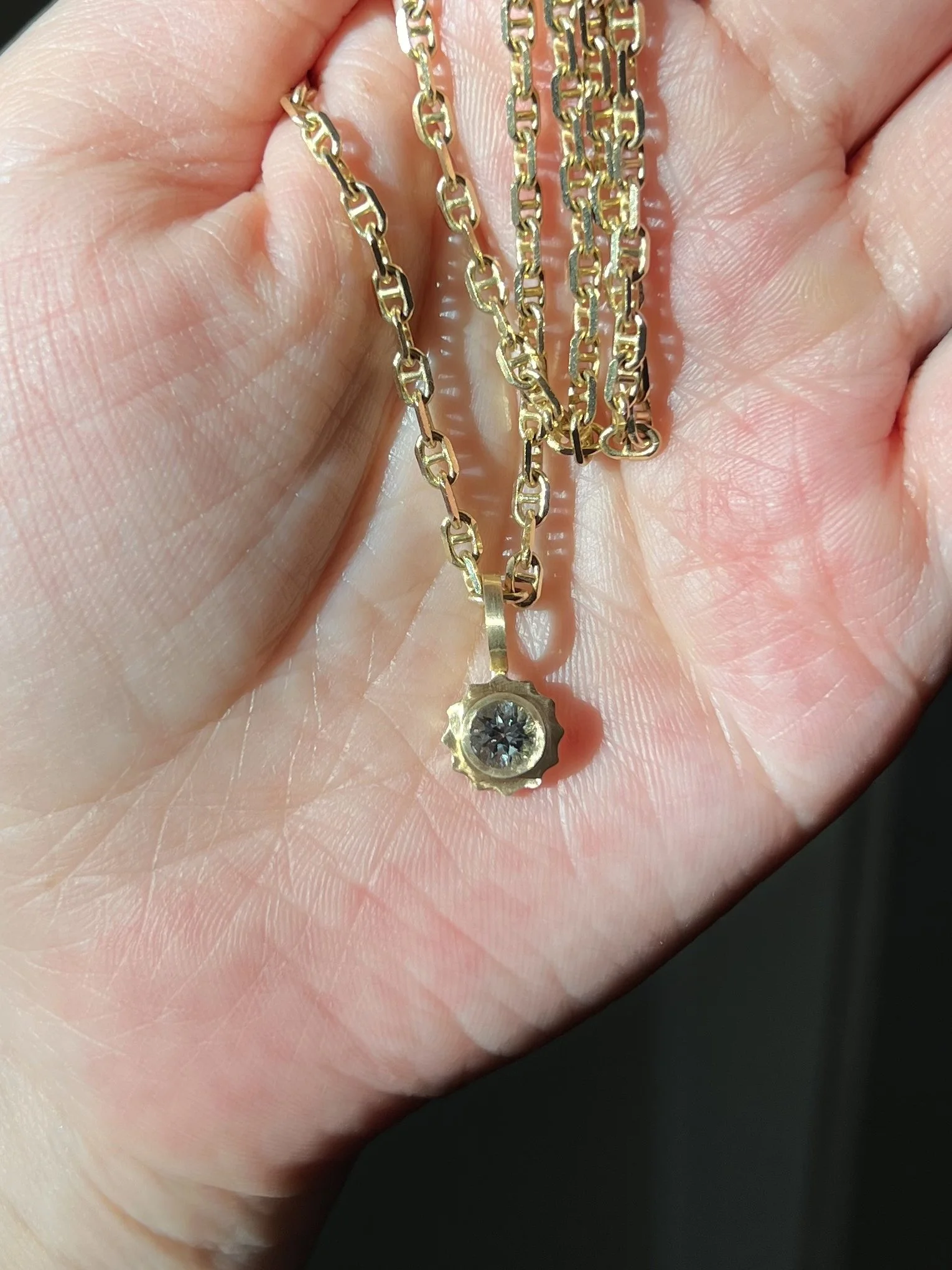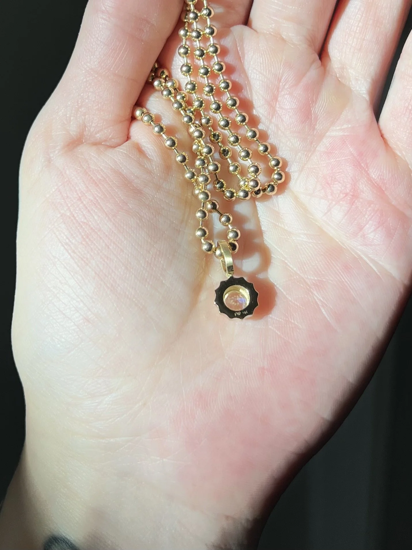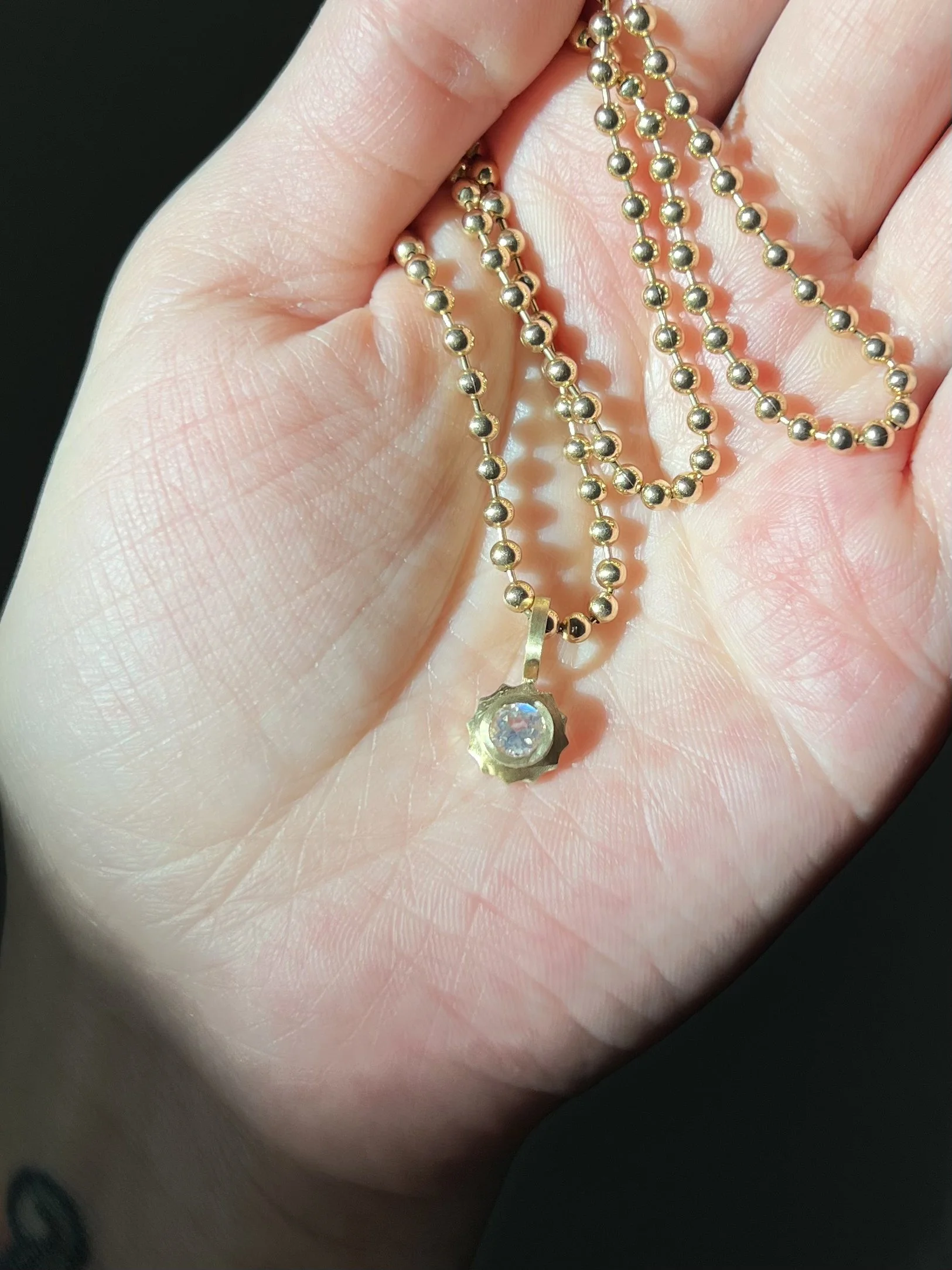 The Mini Tides Charm: Moonstone. 14k brushed yellow gold with a bezel set 5mm round natural faceted moonstone. Measures approx 9mm in diameter (17mm tall including bail) and weighs approx 1.45 grams.