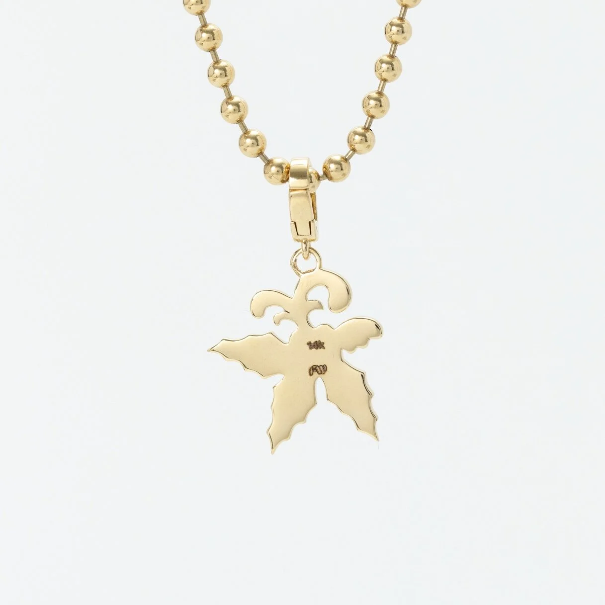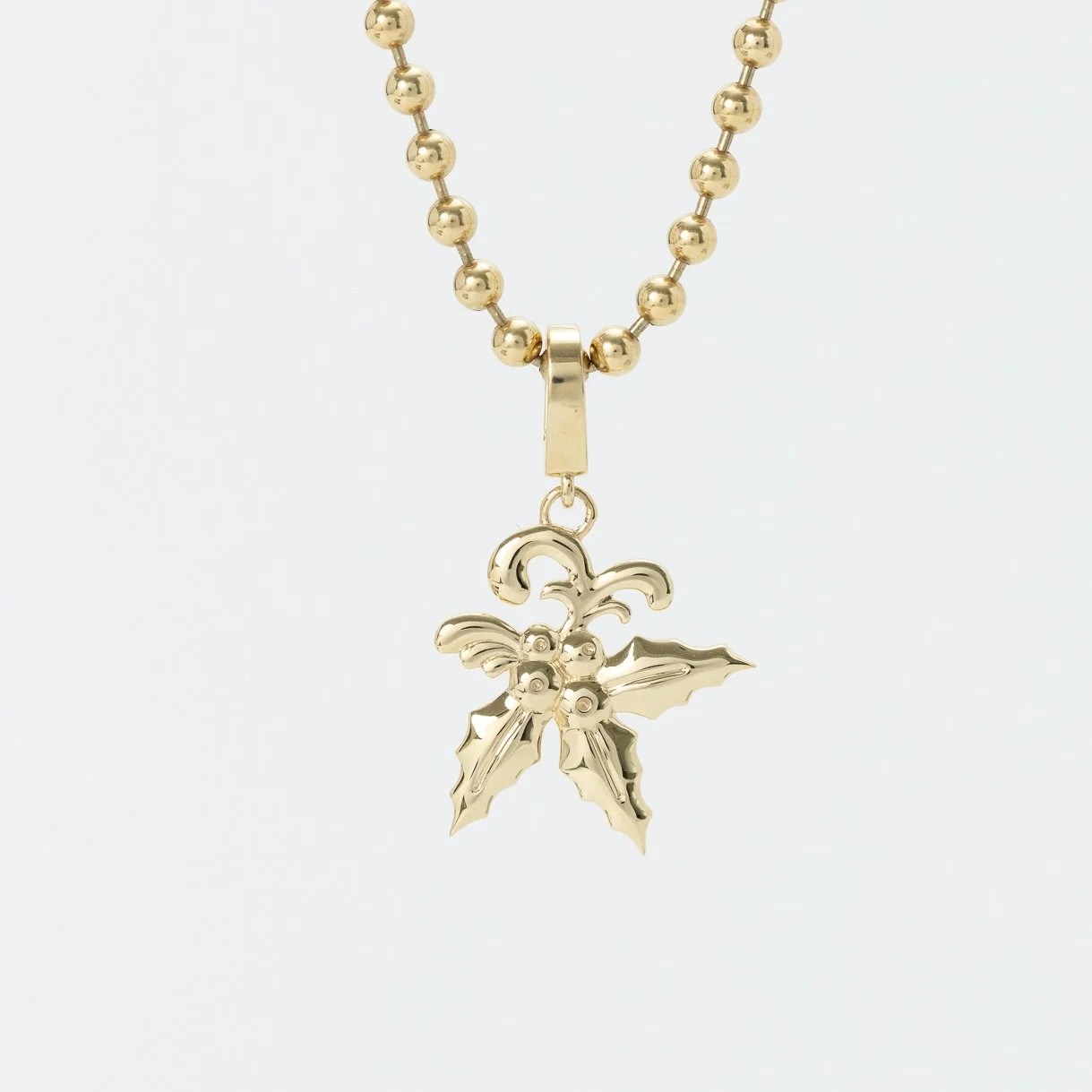 Crafted from 14k yellow gold, this folk inspired sprig of Holly hangs from a hinged bail. Measures approx 20mm tall. 3.44 grams.