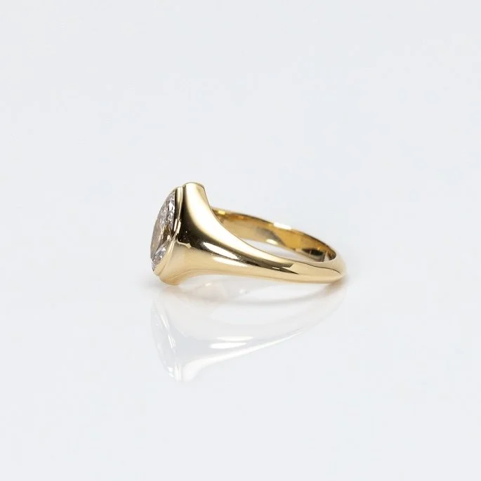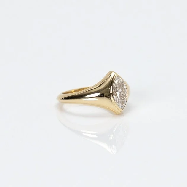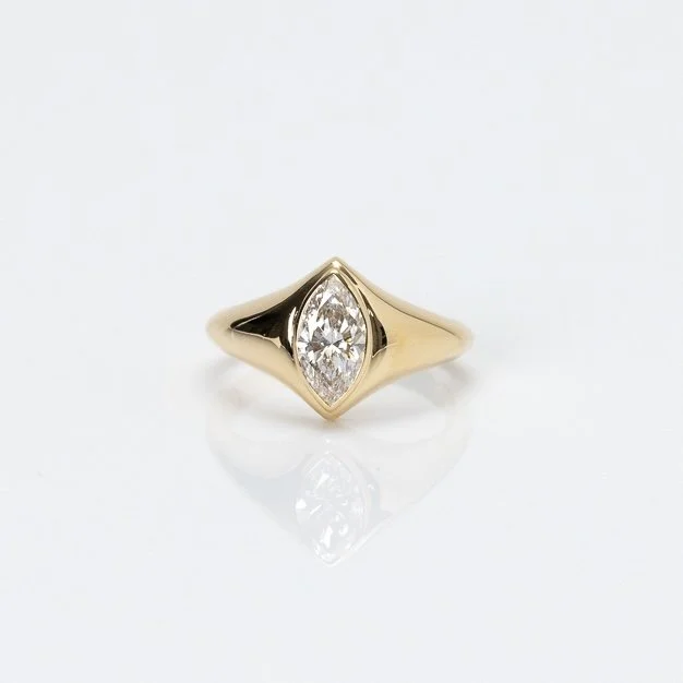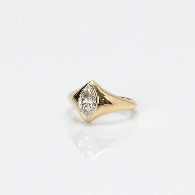 The Marquise Ring: an original signet in 14k yellow gold with a bezel set 0.50ct marquise lab diamond. F/VS. Made to order in your size, this makes a great pinky ring. Measures approx 9.5mm tall on the face of the ring. Weight and dimensions will vary by size.