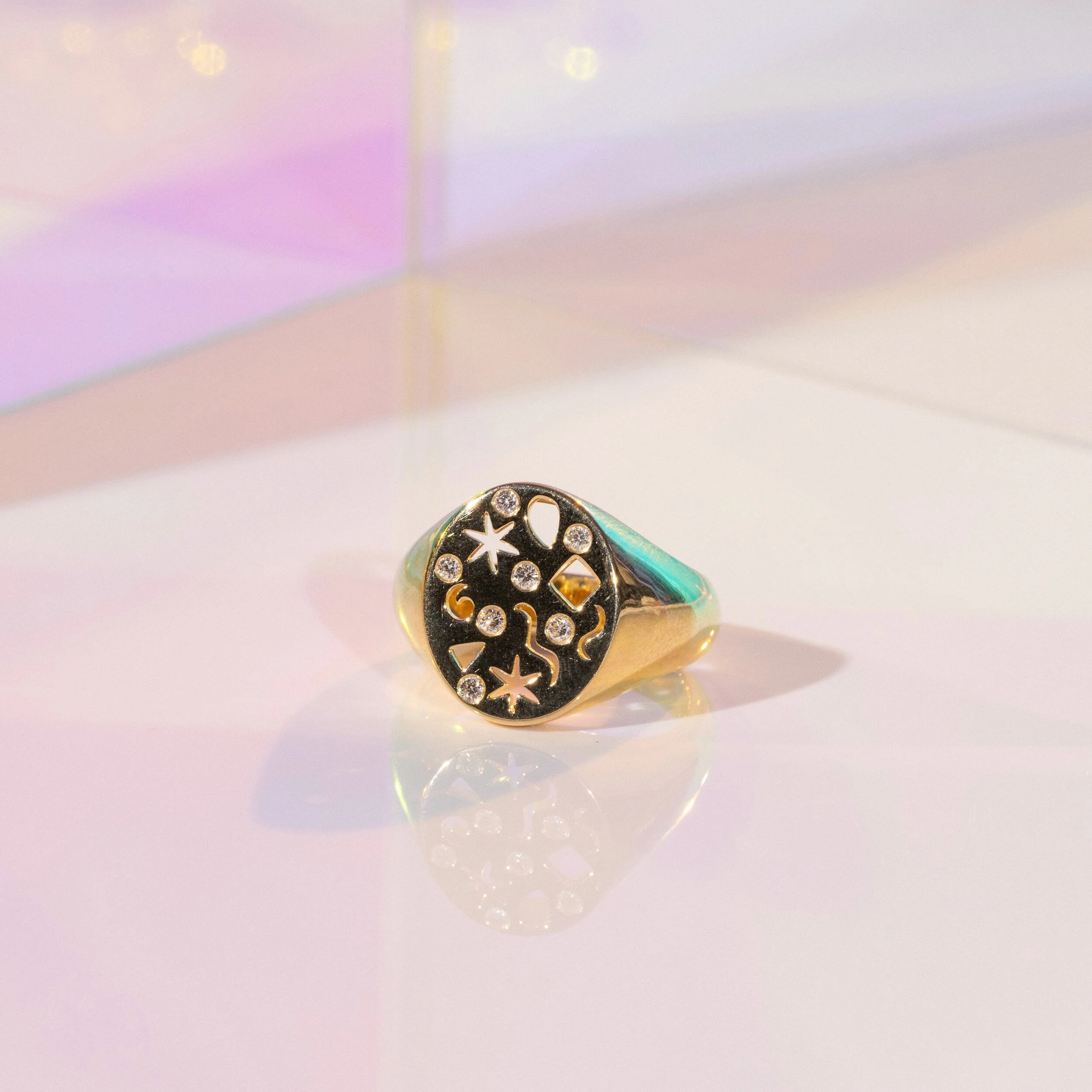 A Fare Well Fine Original: The Memphis Ring. 14k yellow gold oval signet style ring with cut out designs and flush set diamonds. The face measures 14mm tall. Weighs 5.85 grams at a size 6. Weight varies by size. Production time is 4-8 weeks. Made to order in your size.