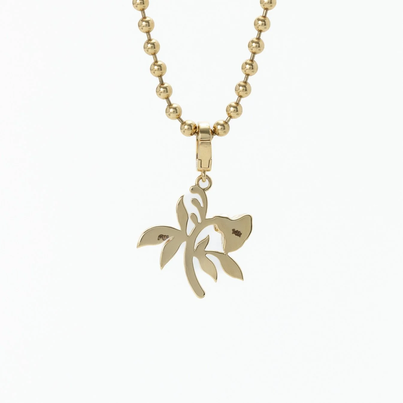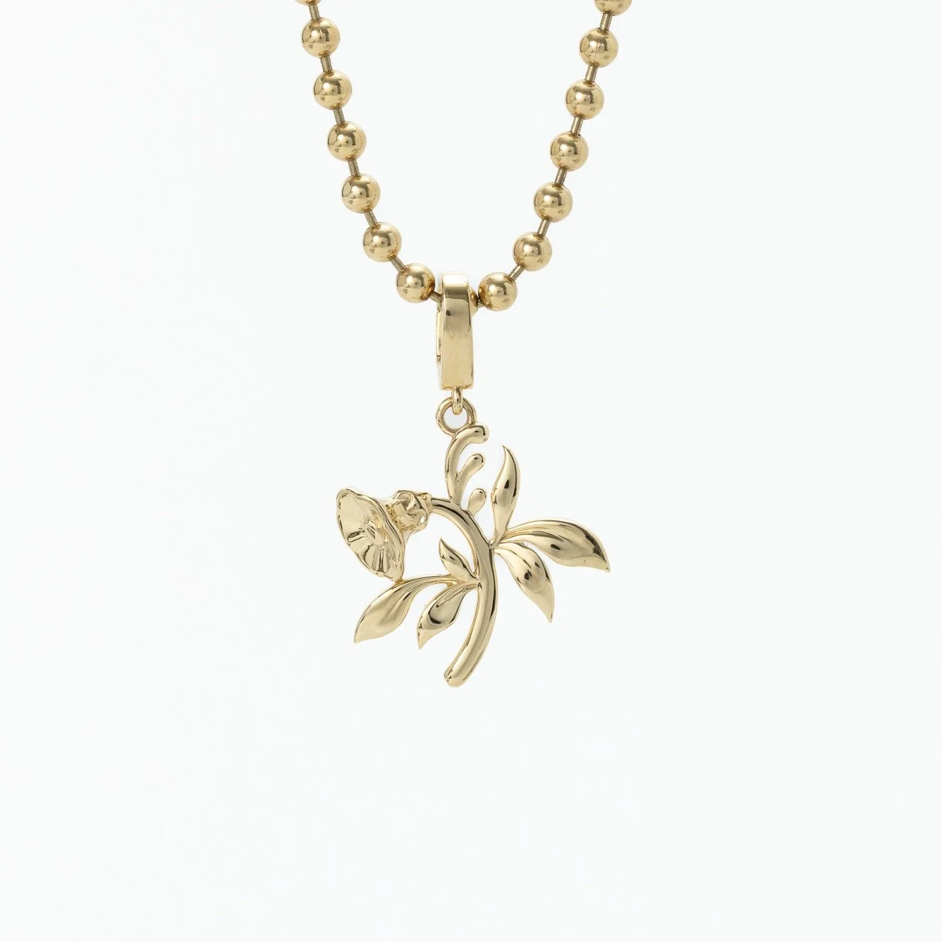 Crafted in 14k yellow gold, this folk inspired morning glory flower also has a hinged bail. Measures approx 21mm tall. Weighs 3.18 grams.